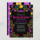 Doce Floral Sessenta Convite para a 16ª comemoração de aniversário da sua filha. Este tema bonito apresenta flores brilhantes e coloridas de arte folclórica mexicana em vermelho, rosa, roxo e amarelo sobre fundo preto. A parte de trás do cartão tem a fiesta mexicana, o papel floral picado em roxo brilhante, amarelo e rosa. O modelo está pronto para você personalizar o cartão com todos os seus detalhes pessoais para sua doce festa de aniversário de 16 anos. Procure na nossa loja itens correspondentes e coordenadores.