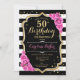 Elegante convite floral feminino de 50 anos com sua foto no final do cartão. Design cor-de-rosa preto brilhante com ouro brilhante. Apresenta faixas pretas e brancas, rosas cor-de-rosa pinceladas, fontes de script e confetti. Perfeito para uma festa de comemoração de na moda adulto. Personalize com seus próprios detalhes. Pode ser personalizado para qualquer idade! Impressos convites Zazzle ou modelo de impressão digital instantânea para download.