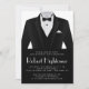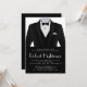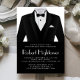 This classy men's birthday party invitation features an image of a black tuxedo with white shirt and black bow tie. The invitation and details appear in white sans serif type, with the guest of honor's name in an art deco-inspired font. The back is solid black.