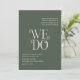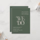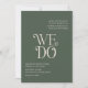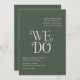 Convite moderno de casamento com um layout mínimo com "Nós fazemos" em tipografia ousada no meio. Todos os elementos de design estão em verde-musgo escuro e marfim e podem ser alterados na ferramenta de edição de design. Este simples mas elegante convite de casamento é excelente de um casamento informal ou formal.