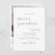 Invitaciones de boda en español. Una invitación elegante en blanco y negro. Al frente, un diseño limpio sobre fondo blanco destaca el texto principal de la invitación, escrito en una combinación de tipografía clásica y caligrafía moderna. Al reverso, una foto de la pareja acompaña un código QR y un espacio dedicado a los detalles del evento, para que se impõe um adjetivo adepto fácilmente a la web de la boda. Un diseño sencillo y moderno, perfeto para cualquier temporada o estilo de celebración. Versión en inglés también!