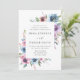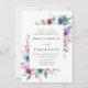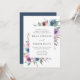 Convites florais elegantes que exibem seus detalhes de casamento emoldurados por uma borda de flores roxas, maduras e azuis com folhas verdes e peludas. O fundo apresenta um fundo azul escuro sólido. Projetado para coordenar com nossa coleção de casamento Midnight Blooms.