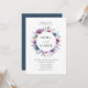 Convites florais elegantes que exibem seus nomes cercados por um enquadrado por uma borda superior e inferior de flores roxas, mauve e azuis com folhas verdes e peludas. Personalize os convites florais roxos e azuis adicionando seus detalhes de casamento abaixo. O fundo apresenta um fundo azul escuro sólido. Projetado para coordenar com nossa coleção de casamento Midnight Blooms.