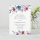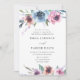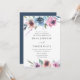 Convites de casamento florais elegantes que exibem seus detalhes de casamento emoldurados por uma borda superior e inferior de flores púrpuras, mauve e azuis com folhas verdes e peludas. O fundo apresenta um fundo azul escuro sólido. Projetado para coordenar com nossa coleção de casamento Midnight Blooms.