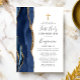 A borda esquerda deste elegante convite de primeira comunhão moderno apresenta uma borda azul de agata, aparada com falso brilho dourado. Uma cruz falsa de folha de ouro aparece acima do texto personalizável, que combina escrita manual, copperplate e fontes itálicas em cinzas de carvão em um fundo branco. O verso apresenta um design de agate azul e dourado correspondente.