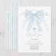 Featuring a soft powder-blue ribbon bow adorned with delicate florals and pearls, plus a classic cross and airy script typography.
