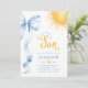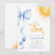 This Here Comes the Sun baby shower invitation features a bright watercolor sun paired with a prominently highlighted blue bow, creating a charming and joyful design for celebrating a baby boy.