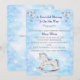 Celebrate the upcoming arrival of a baby boy with this beautiful blue chinoiserie baby shower card, featuring a charming rocking horse and balloon design set against a soft pastel blue watercolor background.