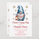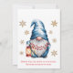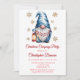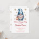 A whimsical watercolor illustration of a Christmas gnome in a blue and white winter theme. The gnome wears a tall pointed hat with a blue and white gradient pattern and small white snowflakes. The hat has a pointed tip and a curved brim. The gnome has a large round pink nose, a long white beard, and is decorated with a string of red berries across its chest. The gnome is holding a glowing red lantern with a warm yellow light inside. The background features golden snowflake patterns scattered around the gnome. The snowflakes are detailed with intricate star patterns and vary in size. The gnome's body is painted in a blue and white watercolor style with subtle texture and shading. The overall illustration has a soft, painterly quality with white space around the elements. The composition is centered with the snowflakes creating a festive border around the gnome.