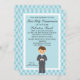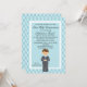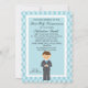 Comece a comemorar com este adorável convite para aqueles rapazes especiais Primeira Comunhão Sagrada. Tem uma grande borda de bolinhas azul clara e escura. no centro há um centro azul claro com uma borda branca ao redor dele Há um garoto adorável vestindo uma cinza com uma gravata azul. Ele tem cabelo castanho. Veja os muitos outros itens nesta linha, como etiquetas, postagens, notas de agradecimento e muito mais.