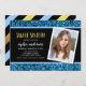 O Convite de aniversário Blue Glitter Photo apresenta as palavras "Doce Dezesseis" em uma fonte sans serif divertida em uma folha de ouro falso com brilho azul superior e inferior e um fundo central preto. O convite tem um padrão de tiras de folhas de ouro azul, pretas e sujas no verso. Personalize-o substituindo o texto do marcador de posição e substitua a foto do marcador de amostra/marcador de posição por sua própria foto. Para obter mais opções, como alterar a fonte e seu tamanho/cor ou o espaçamento entre letras, clique no botão "Personalizar". *Observe que a Marca d'água do Zazzle que aparece na visualização de zoom NÃO aparecerá no produto impresso final. Espaço reservado Fotografia © Storytree Studios, Stanford, CA Invitation © Rosewood and Citrus