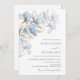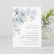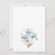 This elegant wedding invitation features AI created white 3 dimensional blue and gold flowers on a white background.