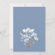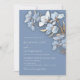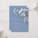 This elegant wedding invitation features AI created white 3 dimensional blue and gold flowers on a dusty blue background.