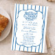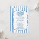 Designed in a blue and white color palette, this invitation features vertical stripes, a softly scalloped frame, and an adorable hand-drawn bread basket illustration that brings the beloved bun in the oven theme to life. The mix of elegant script and clean serif typography creates a balanced look that feels warm, welcoming, and perfect for both modern and traditional celebrations.
