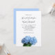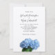 Convite de casamento simples e casual com design de flores azuis. A hidrangea realista floresce, com folhas verdes, decora o fundo das cartas de 5 x 7 polegadas. O texto preto é adicionado em quatro seções com nomes no script. A formulação é tradicional e é o ponto em que "por favor juntem-se" como primeira linha. O reverso é azul-claro sólido. Mostrado em um tipo de papel atualizado, que pode ser facilmente alterado.