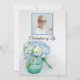 Convide os convidados a lembrarem o seu amado após a sua morte com a bonito Hydrangea Azul na Celebração do Convite à Vida. Este famoso e personalizado convite para homenagem à morte floral apresenta uma fascinante fotografia floral de uma flor azul de hydrangea em um vidro de vidro. Personalize-o com uma fotografia, detalhes do falecido e detalhes do funeral. Disponível como convite impresso para envio e/ou como download digital para fácil compartilhamento digital online.