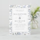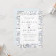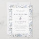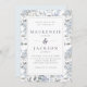 Um convite de casamento bonito e elegante, que inclui um padrão floral de cor d'água de fundo azul de hidrangeas e folhas de fundo branco, sobrepostas com um quadro de retângulo duplo. Os detalhes de casamento estão na fonte azul de carvão azul. O inverso está em azul-claro sólido com detalhes do seu site de casamento e código QR editável.