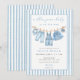 The COLBY blue jean baby shower invite design features a white and light blue denim stripes background with a clothesline full of denim baby clothes, bib and denim baby sneakers, paired with the phrase 'a blue jean baby is on the way' in a light blue script and serif font pair, with the other blue jean themed baby shower details in grey to your blue jean baby shower invitation. Personalize this denim baby shower invitation by adding names, date, time, venue and other details. A back is included with a denim and white stripe pattern.
