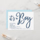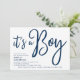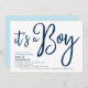 Celebrar a futura mãe ou os pais a serem com este convite para o Chá de fraldas na moda com as palavras "É um Menino" em um roteiro de pincel azul moderno contra um fundo branco. A placa tem um padrão pastel azul e branco esfolado do lado de trás. Personalize-o substituindo o texto do marcador de posição. Para obter mais opções, como alterar a fonte e seu tamanho/cor ou o espaçamento entre letras, clique no botão "Personalizar". *Observe que a Marca d'água do Zazzle que aparece na visualização de zoom NÃO aparecerá no produto impresso final. © Rosewood e Citrus