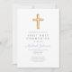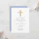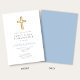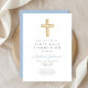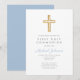 Personalized Blue Script Religious Cross Boy First Communion Invitation. Part of the Dusty Blue Script Cross Boy First Communion Suite with matching stationery and party accessories available.