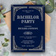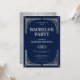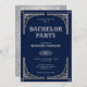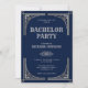 Convide seus hóspedes com este Excelente de vintage Gatsby para um convite de despedida de solteiro com borda decorativa de prata com tipografia elegante contra fundo azul. Basta adicionar os detalhes do seu evento neste modelo fácil de usar para torná-lo um convite de tipo único. Sacudir a carta para revelar um lindo padrão de estrelas prateadas na parte traseira da carta.