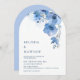 This elegant contemporary wedding invitation features watercolor painted blue flowers on a white background.