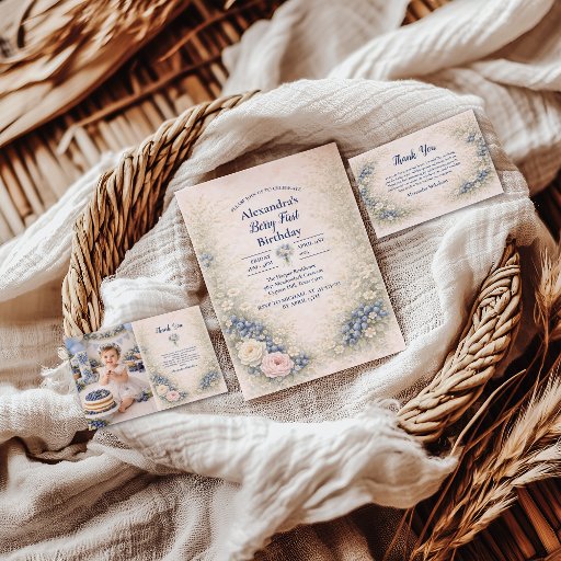 This soft blueberry garden collection features delicate florals and mixed berry details arranged in a romantic storybook frame. The airy ivory background and muted blue tones create a timeless, elegant look perfect for a Berry First celebration. Designed to feel refined yet playful, this collection works beautifully for garden parties, spring celebrations, and sweet first birthdays with a classic botanical aesthetic.