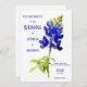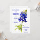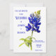 Uma fotografia única "de um tipo" de uma flor do Texas Bluebonnet com caule e folhas. Um fecho das pétalas azuis e um fundo macio que desaparece para um branco limpo. Um design moderno do tipo na cor azul da flor. Preencha com suas informações de casamento na parte de trás deste conjunto único de convites para o casamento.