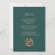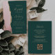 A borda esquerda deste elegante convite de casamento moderno apresenta uma cor-de-água rosa pincelada com borda falsa de ouro. O texto personalizável combina manuscritos dourados, placas de impressão e fontes itálicas em um fundo verde esmeralda. O verso fornece espaço para detalhes do casamento em um fundo verde esmeralda sólido, junto com um código QR que os convidados podem digitalizar para visitar seu site e RSVP, o que economiza o custo de imprimir e enviar cartões RSVP separados.