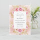 This design features a soft watercolor wash in delicate shades of blush pink and peach. Lush roses in varying hues of pink create a romantic border, accented by elegant golden-toned foliage and leaves. The overall aesthetic is ethereal and refined, making it ideal for a spring or summer event.