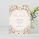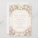 A romantic garden design featuring soft blush tulips, creamy white lilies, and delicate wild blossoms arranged in an elegant symmetrical floral frame. Airy sage greenery and subtle vintage detailing surround a warm parchment background, creating a refined, timeless aesthetic. The composition feels light, graceful, and classically feminine — perfect for an elevated celebration with a soft spring garden atmosphere.