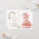 Design de cartão elegante com cantos de flores brancas, cor d'água delicada, cantos de flores esbranquiçadas, uma falso estrutura dourada, divisor floral, foto do seu bebê (fácil de ser adicionado) em um fundo branco. Na parte de trás buquê e cruz flores brancas. Use a ferramenta Personalizar para adicionar suas informações. Para obter itens correspondentes, visite minha coleção de fotos de Natal Baptism.