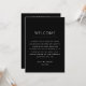 Bem-vindos aos seus hóspedes em estilo com este cartão itinerário do fim de semana do casamento preto, com um design de linha do tempo elegante que é tão prático quanto bonito. Retire toda a celebração - do janto de boas-vindas ao brunch de despedida - para que amigos e familiares saibam exatamente onde estar e quando. Perfeito para casamentos de gravatas negras, encontros de destino e comemorações de vários dias. Este cartão adiciona um toque polido e coordenado à papelaria de casamento enquanto os convidados fazeres se sentem instantaneamente incluídos no seu fim de semana especial. Disponível como cartão impresso ou download digital para fácil impressão.