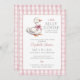 Este charmoso convite para chás de fraldas apresenta um ganso bonito e um fundo cor-de-rosa de gingham. Com o código QR do registro e os detalhes do evento no verso. Projetado por Thisnotme©
