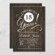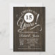 Convite de festa de 15 anos de casamento rústico com padrão de madeira marrom escuro e fonte escrita branca. Saúde por 15 anos! Perfeito para uma celebração elegante.