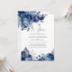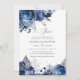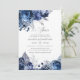 Convites de bodas de prata de 25 anos de casamento florais azul marinho e branco com sotaques de folha de prata.