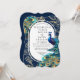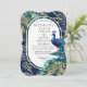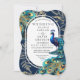 Um convite para casamento de na moda moderno com um pavão elegante. Ouro azul verde e turquesa com linha dourada, escrita clássica, caligrafia elegante e minimalista (imitação do pó prateado e do ouro). Um belo e elegante convite de casamento, simples e moderno.