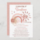 Boho apresenta sol, arco-íris, lua e estrelas com flores cor-de-rosa e gramíneas secas, buquê "Um Pequeno Raio de Sol Está a Caminho", menina design de chá de fraldas virtual. Apresenta tonalidades de cor rosada, cor-de-rosa e terracota média e escura em branco. A parte de trás apresenta um fundo rosado rosa e escuro de terracota irregular, para se coordenar com o estilhaço no arco-íris na frente. Design composto por Designs Holiday Hearts.
