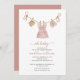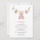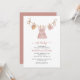 Oh, então roupas doces de bebê penduradas numa linha de roupa neste convite para chá de fraldas de vassoura. Vestidos, calçados e um chapéu com flores e galhadas minúsculas. Este convite encantador tem tipografia de script com as palavras oh baby em rosa mutado, bem como um roteiro para o nome da mãe.
