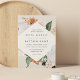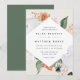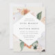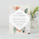 O convite para o casamento floral elegante apresenta os detalhes do seu casamento em letras modernas, em um quadro em forma de diamante geométrico de flores de aquarela pastel e folhagem botânica em tons de terra inspirados no deserto, de pêssego, verde-sábio, branco e marfim.