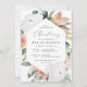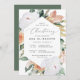 O convite elongante para batizar floral apresenta um elongado quadro hexagonal de flores de aquarela e folhagem em tons de pêssego, branco, marfim e verde-sábio inspirados no deserto de boho. Personalize com sua cerimônia religiosa e batizando detalhes do partido em letras modernas.