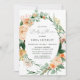 Lindos convites para bebês com um elegante tom pastel neutro e neutro molhado de cor aquática quadro floral botânico em tons suaves de pêssego, laranja, pincel suave, amarelos e muitos tons de verde de sábio verde a verdes brilhantes e profundos. Seus detalhes personalizados são exibidos em um elevado layout tipográfico que coloca o convidado de honra em frente e no centro.