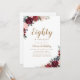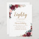 Pintado de cor d'água, floral botânico, vermelho borrado, rosa pincelado e azul marinho, com escrita dourada "Oitenta e fabulosa", convites de festas de aniversários 80 modernos e elegantes.