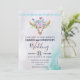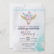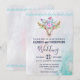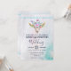 Um convite de casamento com um fundo de aquarela turquesa e pastel. Uma caveira de animal boho chic com um buquê floral sobre a cabeça e borboletas voando ao redor. Uma borda decorativa fofa com pequenas formas de lágrima em azul claro.