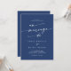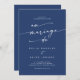 Este convite para casamento francês, com o código de QR azul real, é perfeito para um casamento minimalista. O ousado design boêmico azul escuro e moderno apresenta uma caligrafia rústica simples com um estilo único, mas clássico. Inclua um código QR na parte traseira do seu convite de casamento para que o convidado possa facilmente RSVP, ver detalhes ou ambos.
