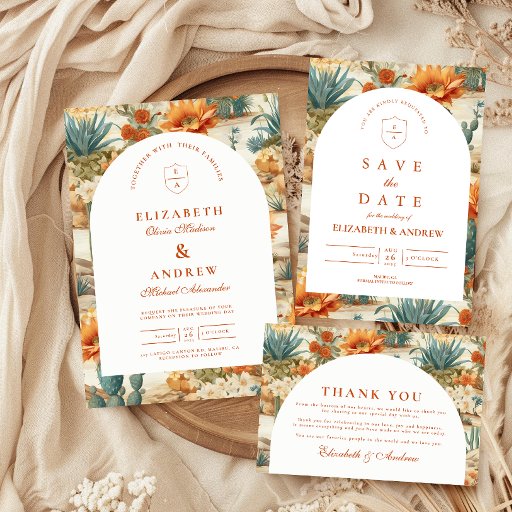 A refined western-inspired design featuring warm desert florals, cacti, and earthy botanicals arranged in a rich, painterly composition. The arched layout adds a timeless architectural feel, balancing the bold surrounding pattern with a clean, elegant center. Terracotta tones, soft neutrals, and muted greens create a grounded yet romantic palette—perfect for a modern desert or western celebration. Ideal for couples who want something unique, artistic, and effortlessly sophisticated.