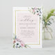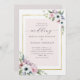 Um convite de casamento elegante e rústico, com uma fina e na moda floral moldura de anêmonas, rosas, eucalipto e outras flores verdes, bagas e outras, pintadas em aquarela; além de uma moldura de ouro com escovas de mão (não ouro real, este é um efeito digital), sobre um fundo cor-de-rosa empoeirado. Uma bela escolha de primavera, verão ou casamento outono para noivas que adoram ouro, blush, anêmonas, rosas, variedade no buquê de noiva e elegância rústica.