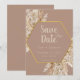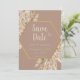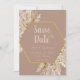 Elegante convite boêmio para salvar a data com grama das pampas suave, flores bege rosadas e uma paleta terrosa neutra. Perfeito para casamentos rústicos, cerimônias ao ar livre ou celebrações inspiradas na natureza. Modelo personalizável com os detalhes do seu evento. Impresso em papel premium para um souvenir atemporal.
