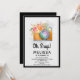 Um convite de aniversário com uma ilustração de aquarela de uma câmera laranja e um buquê de flores descansando em cima. As flores no buquê são rosa claro e laranja com folhas verdes, uma bela arranjo floral. Borda preta ao longo da parte externa.