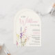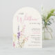 An elegant and whimsical light cream arch-shaped baby girl shower invitation featuring "a little wildflower is on her way" in a blend of grey typography and a stylish pink script, and a boho-inspired watercolor bouquet of dainty purple, pink and yellow wildflowers.